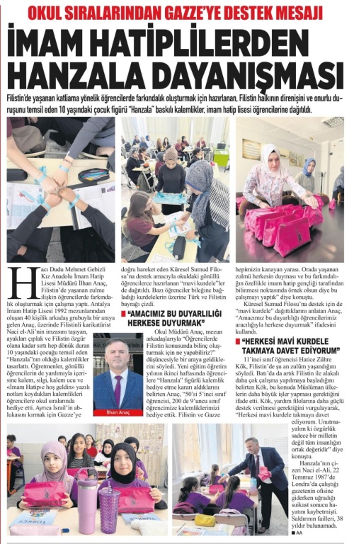 Antalya İmam Hatip Lisesi 1992 mezunlarından oluşan 40 kişilik arkadaş grubuyla bir araya gelen Anaç, üzerinde Filistinli karikatürist Naci el-Ali’nin imzasını taşıyan, ayakları çıplak ve Filistin özgür olana kadar sırtı hep dönük duran 10 yaşındaki çocuğu temsil eden “Hanzala”nın olduğu kalemlikler tasarlattı.