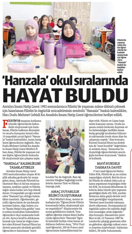Antalya İmam Hatip Lisesi 1992 mezunları Filistin'de yaşanan zülme dikkat çekmek için hazırlanan Filistin'in özgürlük mücadelesinin sembolü "Hanzala" baskılı kalemlikleri, okulumuz öğrencilerine hediye ettiler. Bununla ilgili ulusal basına yansıyanlar.